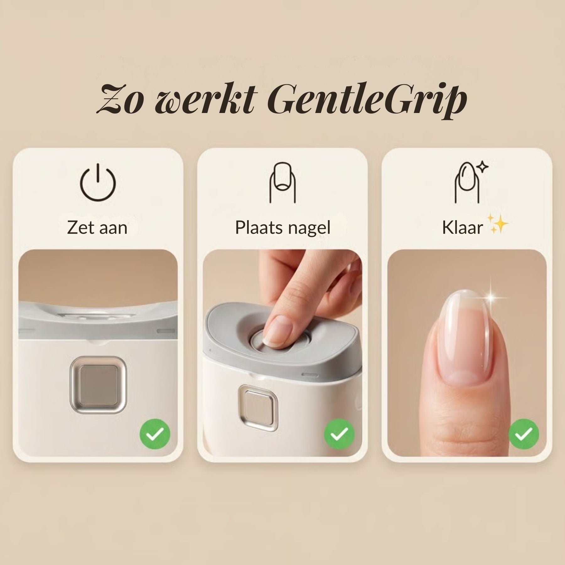 Zorg ervoor dat je nagels schoon en droog zijn voordat je begint. Zet de GentleGrip Elektrische Nagelknipper aan met de aan/uit-knop en houd je vinger rustig tegen de opening van de nagelkop. Beweeg de nagel langzaam en zonder druk heen en weer zodat het apparaat de nagel geleidelijk en gelijkmatig korter maakt. Oefen geen kracht uit; de GentleGrip doet het werk voor je. Gebruik het ingebouwde licht om goed zicht te houden tijdens het knippen. Stop zodra de gewenste lengte is bereikt en zet het apparaat uit. Leeg na gebruik het opvangbakje met nagelrestjes en reinig de nagelkop indien nodig voor hygiënisch gebruik.